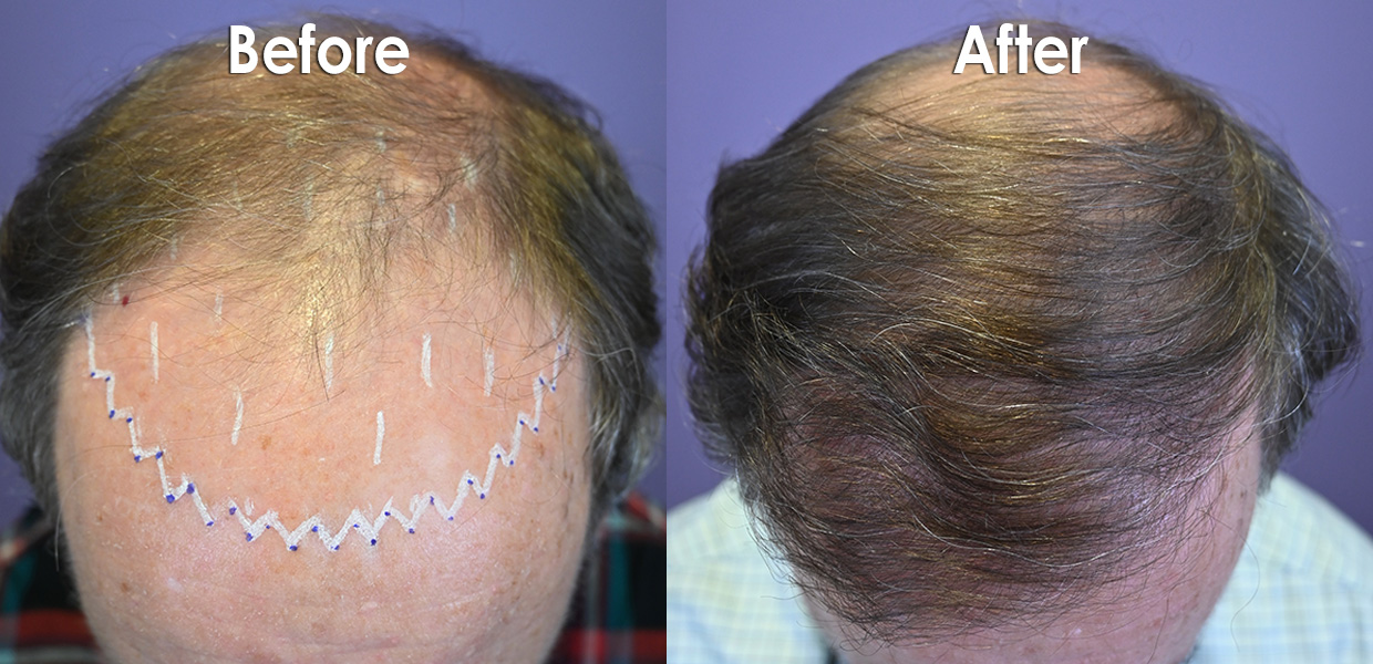Over the course of a year, his hair grew in nicely over the front and the medications helped fill in his crown. The patient was very happy with the result and expressed his amazement at how easy recovery was, and that although friends and colleagues perceived he looked younger, he did not realize it was his new hair!