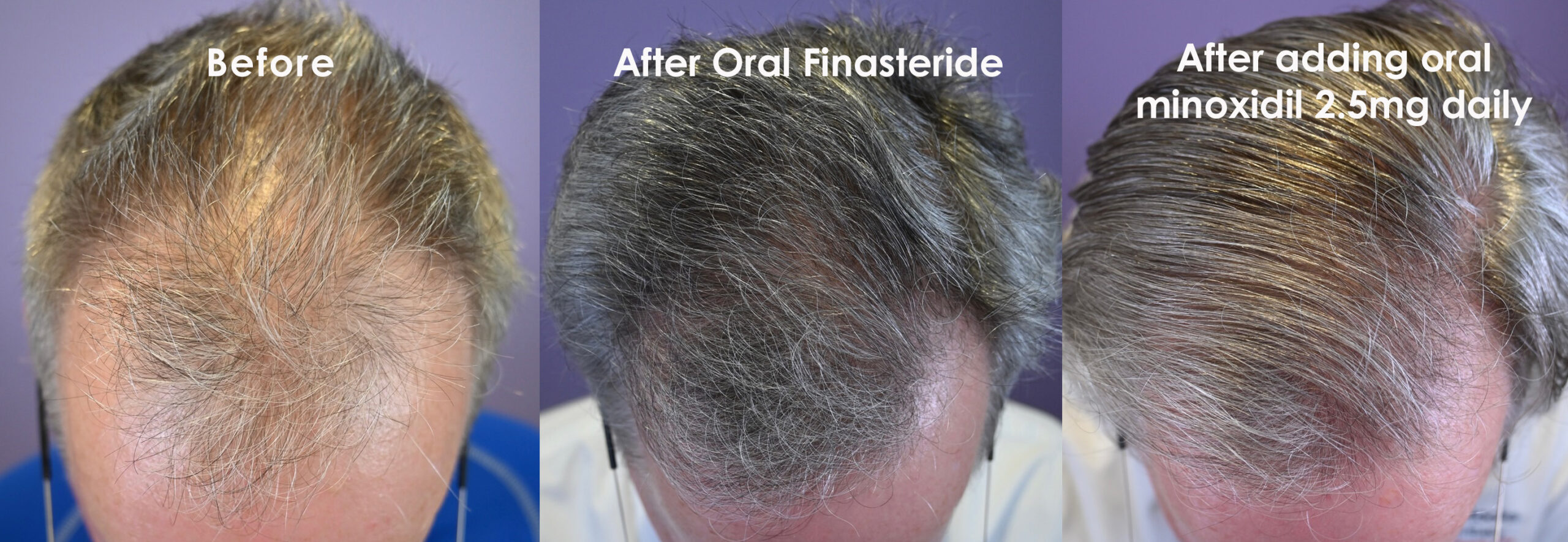 After his first year on finasteride, he was thrilled with the results. The front was filling in more fully, but he still wanted to be able to wear it longer, so we discussed adding oral minoxidil 2.5mg daily to his regimen.