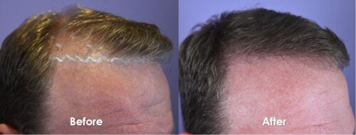 This 54-year-old gentleman came to see us because he missed his “roller coaster bangs” from his 20s. He wanted to add more volume over the frontal scalp and have the fun of styling his hair again. He had no plans to shave his head and we proceeded with a linear strip excision (LSE, also…