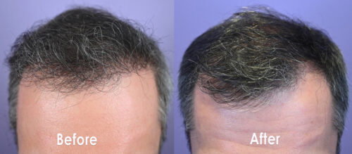 This patient selected FUE hair transplant surgery to avoid a linear scar and trim his hair short on the sides and back. Dr. Rogers also prescribed oral minoxidil 1.25mg daily and a topical version of Dutasteride to maintain his existing hair. He had 1 procedure and will probably have a second procedure to add density…